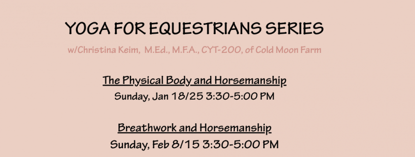 Are you ready to uplevel YOUR horsemanship, improve the relationship with your horse, and remove the obstacles holding you back? If so, join professional equestrian Christina Keim, M.Ed., M.F.A., CYT-200, of Cold Moon Farm, for an Introduction to Equestrian Yoga. Together, we will explore the connections between your physical body, breath, and mindset, and work to unharness your true potential, both in and out of the saddle. NO previous yoga experience is required!